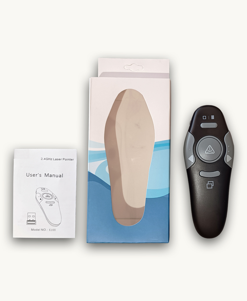 یکی از مزیتهای مهم پرزنتر K100 ، لیزر قرمز (Red Laser) با برد مناسب است که به کاربر امکان میدهد هنگام ارائه، نقاط مورد نظر روی پرده یا تصویر را دقیق نشان دهد. قدرت لیزر به اندازهای است که حتی در محیطهای روشن نیز قابل مشاهده باشد.